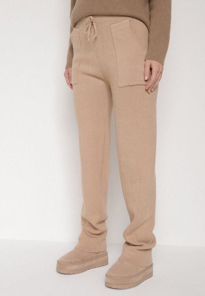 Ciemnobeżowe Sweterkowe Spodnie z Wełną z Ozdobnymi Kieszeniami Monilana