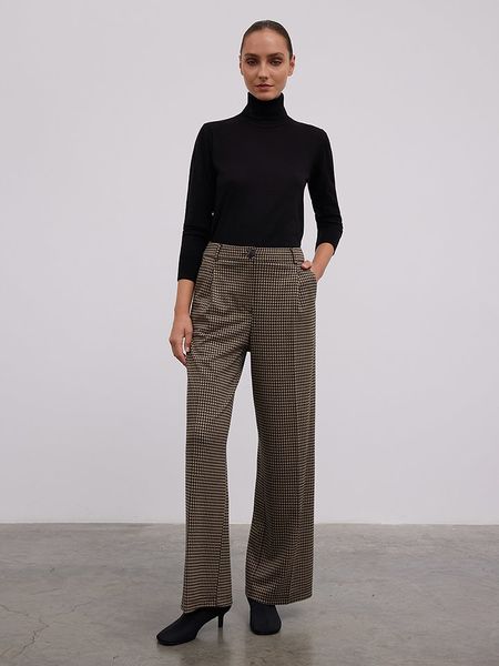 – zapięcie: guzik i suwak- szlufki na pasek: tak- kieszenie: wpuszczane i tylne- detale: plisy- zakończenia nogawek: dzwony- krój: prosty- wzór: pepitkaUwaga: Przy wyborze właściwego wariantu zaleca się korzystanie z tabeli rozmiarów.