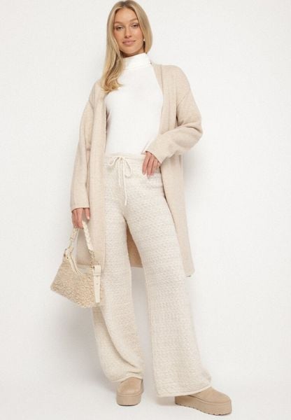 Beżowe Dzianinowe Spodnie o Szerokim Kroju z Domieszką Wełny i Wiskozy Tiemella