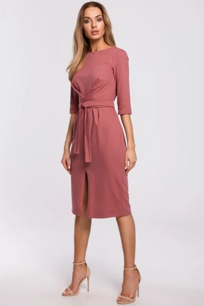Sukienka dopasowana z rozcięciem i wiązaniem różowa bawełna