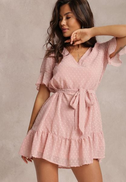 Sukienka Theaniphis trapezowa, z materiałowym paskiem do zawiązania. Długość mini. Dekolt w kształcie trójkąta, rękawy krótkie. Wykończona falbanami przy rękawach oraz na dole. Wykonana z tkaniny plumeti – pokryta uroczymi kropeczkami. Z elastyczną podszewką pod spodem. Będzie perfekcyjną bazą koktajlowego outfitu! Noś ją np. do wiązanych sandałków albo brokatowych szpilek.