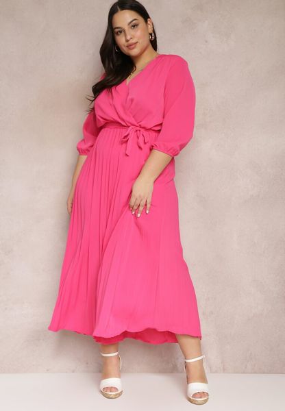 Różowa Kopertowa Sukienka z Gumką i Paskiem w Talii Zdobiona Plisowaniem Kaylina