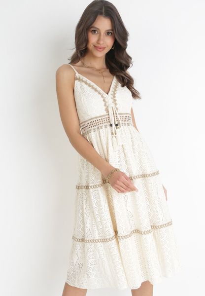 Beżowa Sukienka Midi na Ramiączkach z Ozdobnym Dekoltem i Ażurową Wstawką Aryel
