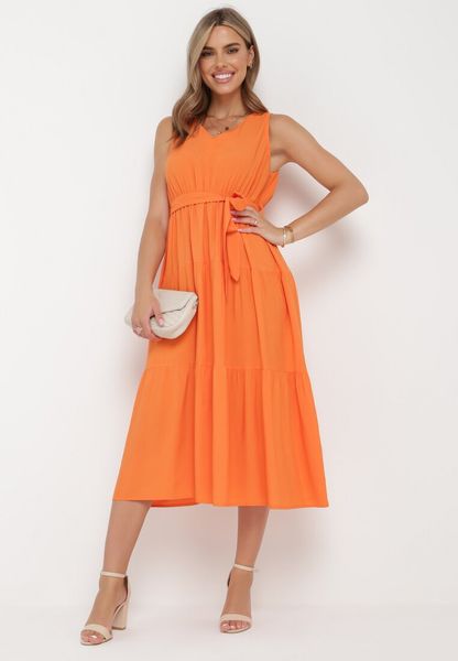 Pomarańczowa Wiskozowa Sukienka Midi z Gumką w Pasie i Materiałowym Paskiem Bicuh
