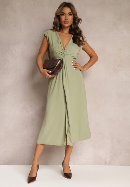 Zielona Midi Sukienka o Rozkloszowanym Fasonie z Ozdobnym Węzłem i Rozcięciem Zanondia