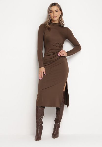 Ciemnobrązowa Taliowana Sukienka Midi z Półgolfem i Marszczeniem Abigiana