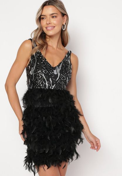 Czarna Sukienka Mini w Pióra i Cekiny Vortega