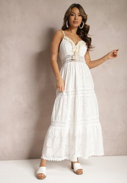 Haftowana sukienka bawełniana o długości maxi, ozdobiona chwostami przy dekolcie – doskonała do letnich stylizacji boho. Ramiączka można regulować, pod spodem podszewka.
