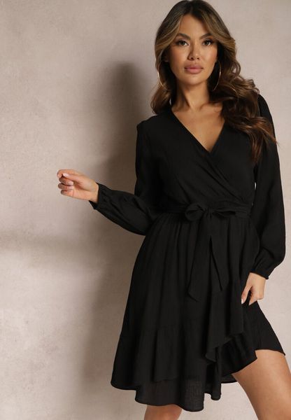 Czarna Rozkloszowana Sukienka Midi z Paskiem w Talii i Kopertowym Dekoltem Gemiora