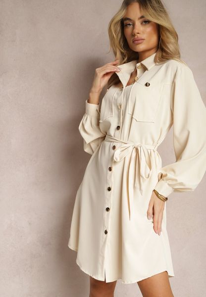 Beżowa Sukienka o Koszulowym Fasonie Utility z Bufiastymi Rękawami Wiązana w Pasie Emianna