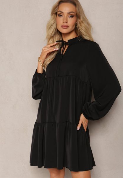 Czarna Sukienka o Rozkloszowanym Fasonie z Falbanką i Okrągłym Dekoltem Vasaia