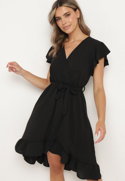 Czarna Kopertowa Sukienka z Asymetrycznym Dołem Ozdobiona Falbanką z Paskiem w Talii Snidia