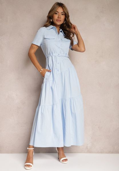 Niebieska Bawełniana Sukienka o Rozkloszowana Zwężana w Talii Nenefia