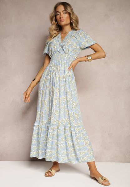 Niebieska Trapezowa Sukienka z Bawełny z Bufiastymi Rękawami Falbaną i Gumką w Talii Vimayana