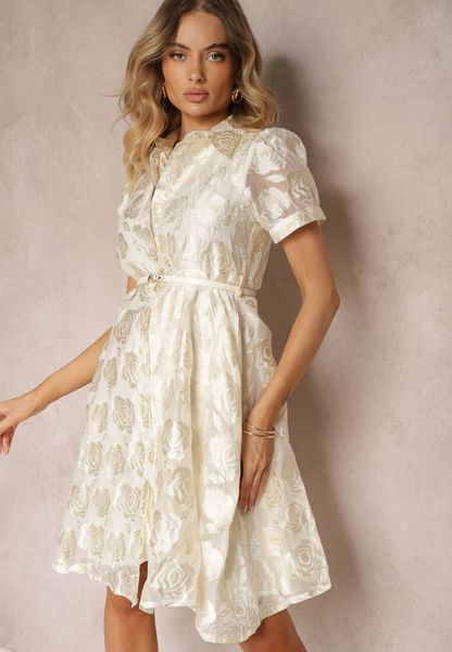 Beżowa Koktajlowa Taliowana Sukienka o Kroju Koszulowym Ozdobiona Paskiem z Perełką Vimalette