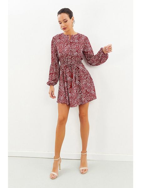 – dekolt: okrągły- zapięcie: listwa guzikowa- w talii wiązanie: tak – krój: rozkloszowany- wzór: na całości
