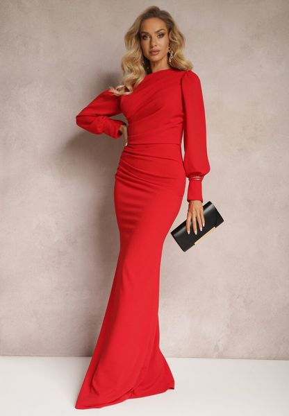 Czerwona Dopasowana Sukienka Maxi o Asymetrycznym Kroju z Bufiastymi Rękawami i Rozcięciem Belsara