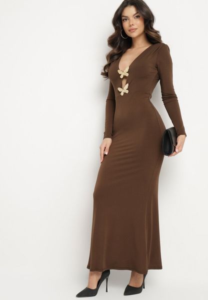 Brązowa Taliowana Sukienka Zdobiona Aplikacjami w Kształcie Motyli Nalovira