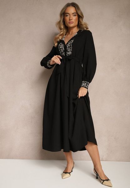 Czarna Sukienka Rozkloszowana z Wiskozą Zdobiona Haftem i Wiązana w Talii Ninalisa