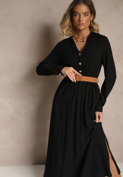 Czarna Wiskozowa Sukienka o Rozkloszowanym Kroju z Paskiem i Rozcięciem Reirissa