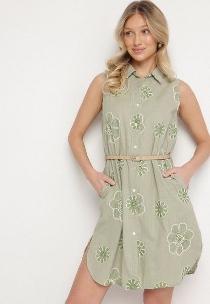 Jasnozielona Bawełniana Sukienka Koszulowa w Haftowane Kwiaty z Paskiem z Klamrą Turivana