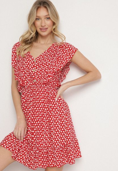 Czerwona Rozkloszowana Sukienka z Bawełny w Kwiaty z Guzikami Ronelle