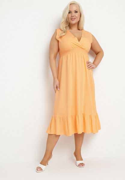 Pomarańczowa Wiskozowa Sukienka o Kopertowym Kroju z Falbanką Uliria