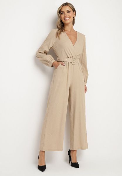 Beżowy Bawełniany Kombinezon o Kopertowym Kroju z Paskiem i Gumką w Talii Mirrira