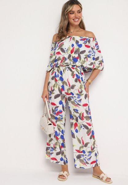 Biało-Niebieski Taliowany Wiskozowy Kombinezon z Hiszpańskim Dekoltem Nelyria
