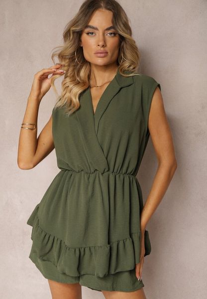 Ciemnozielony Kombinezon z Zakładką Imitującą Spódniczkę i Kołnierzykiem Norinivia