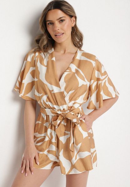 Beżowy Kopertowy Kombinezon z Wiskozą z Wiązanym Paskiem i Krótkimi Nogawkami Folamera