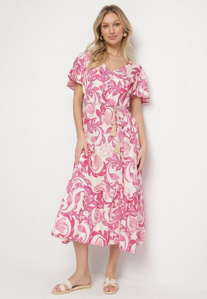 Różowa Pudełkowa Sukienka z Wiskozy w Kwiaty z Dekoltem w Serek Inisara