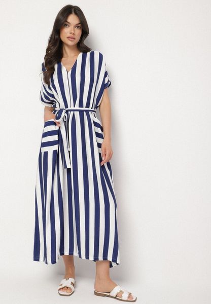 Niebieska Sukienka z Wiskozą i Paskiem w Paski Nerire