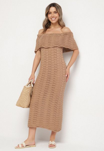 Ciemnobeżowa Ażurowa Sukienka o Fasonie Hiszpanki z Wywijanym Dekoltem Filiorra