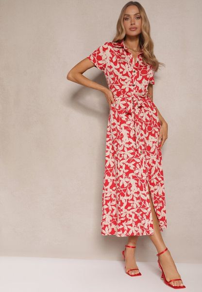 Czerwona Kwiecista Sukienka z Wiskozą o Koszulowym Kroju z Wiązanym Paskiem Zeranella