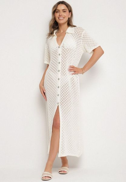 Jasnobeżowa Siateczkowa Sukienka Koszulowa z Bawełną Folaris