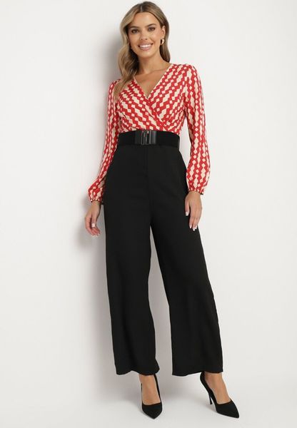 Czerwono-Czarny Wzorzysty Kombinezon Kopertowy z Prostymi Nogawkami i Elastycznym Paskiem Tinadorae