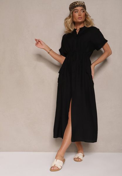 Czarna Sukienka z Wiskozą o Koszulowym Kroju z Wiązaniem w Pasie Pollivia