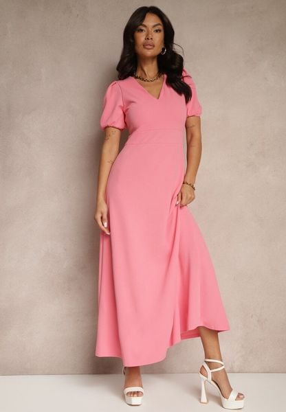 Różowa Rozkloszowana Sukienka z Lekko Bufiastymi Rękawami i Dekoltem V Efrusae