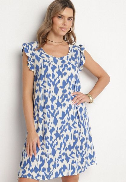 Niebieska Sukienka z Bawełny o Rozkloszowanym Kroju z Falbankami Zamiast Rękawów Jenalinea