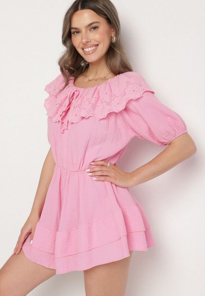 Różowa Bawełniana Sukienka z Ażurową Falbaną i Wiązaniem Univelle