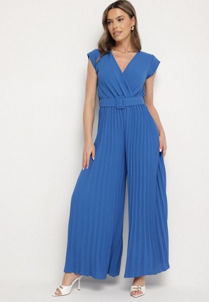 Niebieski Kombinezon o Kopertowym Kroju z Plisami i Paskiem w Talii Salivania