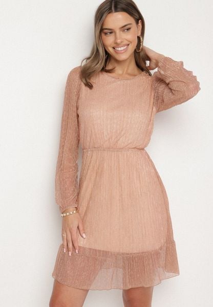 Szampańska Sukienka z Wiskozy Ozdobiona Metaliczną Nicią Meliorea
