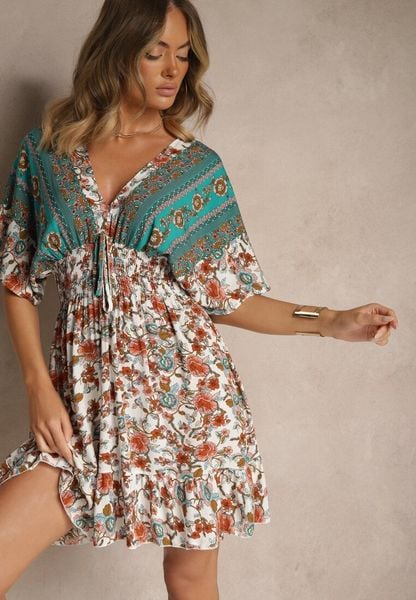 Zielona Sukienka z Wiskozy w Kwiaty Zdobiona Wiązaniem na Plecach Latorea