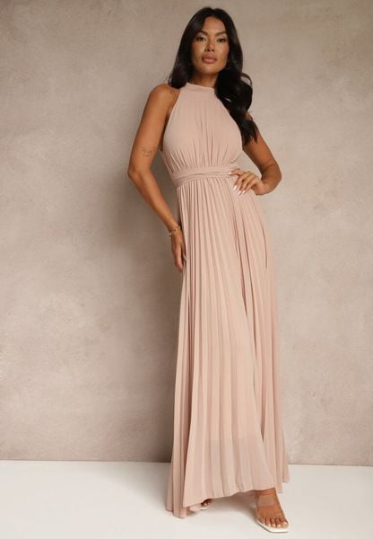 Jasnoróżowa Plisowana Sukienka z Kopertowym Dekoltem i Gumką w Talii Dimitris