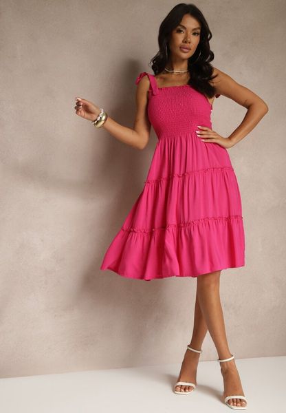 Fuksjowa Sukienka z Wiskozą o Rozkloszowanym Kroju na Ramiączkach z Wiązaniem Aranive