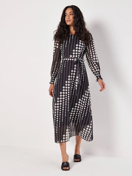 – dekolt: okrągły- zapięcie: suwak na plecach- krój rękawów: bufiasty- zakończenie rękawów: marszczenie- zdejmowany pasek: tkanina- krój: litera A- wzór: na całości