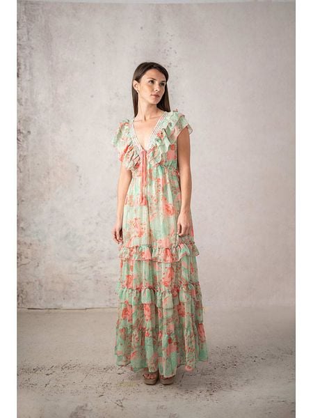 – dekolt: V- zapięcie: wiązane tasiemki- detale: falbany- krój: taliowany- wzór: na całości