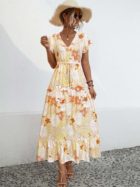 – dekolt: V- krój rękawów: motylek- talia: ściągacz tunelowy- dolny brzeg: z falbankami- detale: ozdobne guziki- krój: litera A- wzór: kwiatowy