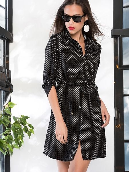 – czysta wiskoza- kołnierz: kent- zapięcie: listwa guzikowa- zakończenie rękawów: mankiet na guzik- zdejmowany pasek: tkanina- szlufki na pasek: tak- krój: prosty- wzór: kropkiUwaga: Przy wyborze właściwego wariantu zaleca się korzystanie z tabeli rozmiarów.